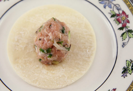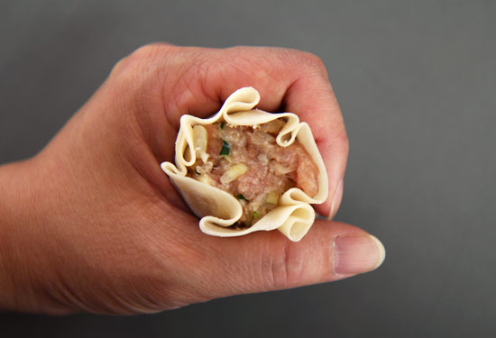 - Place one Chiao Tzu skin in the palm of one hand. With the other hand, place 1 heaping tablespoon of filling in the centre of the skin. Then, using both hands, bring the skin around the filling, leaving the top open, and shaping it into a cylinder.